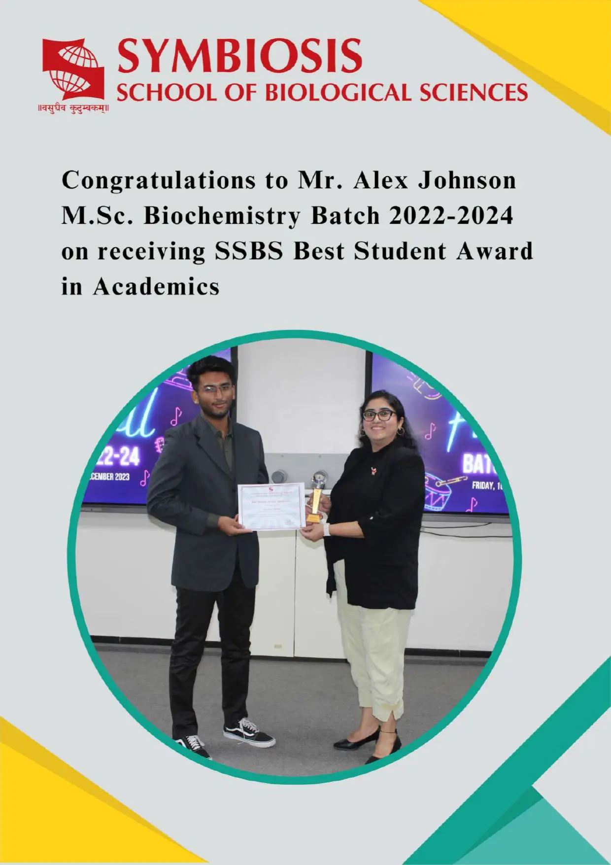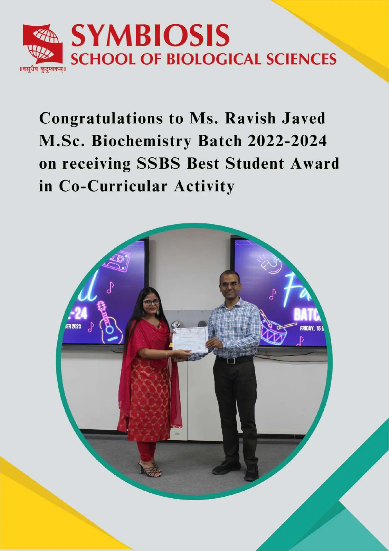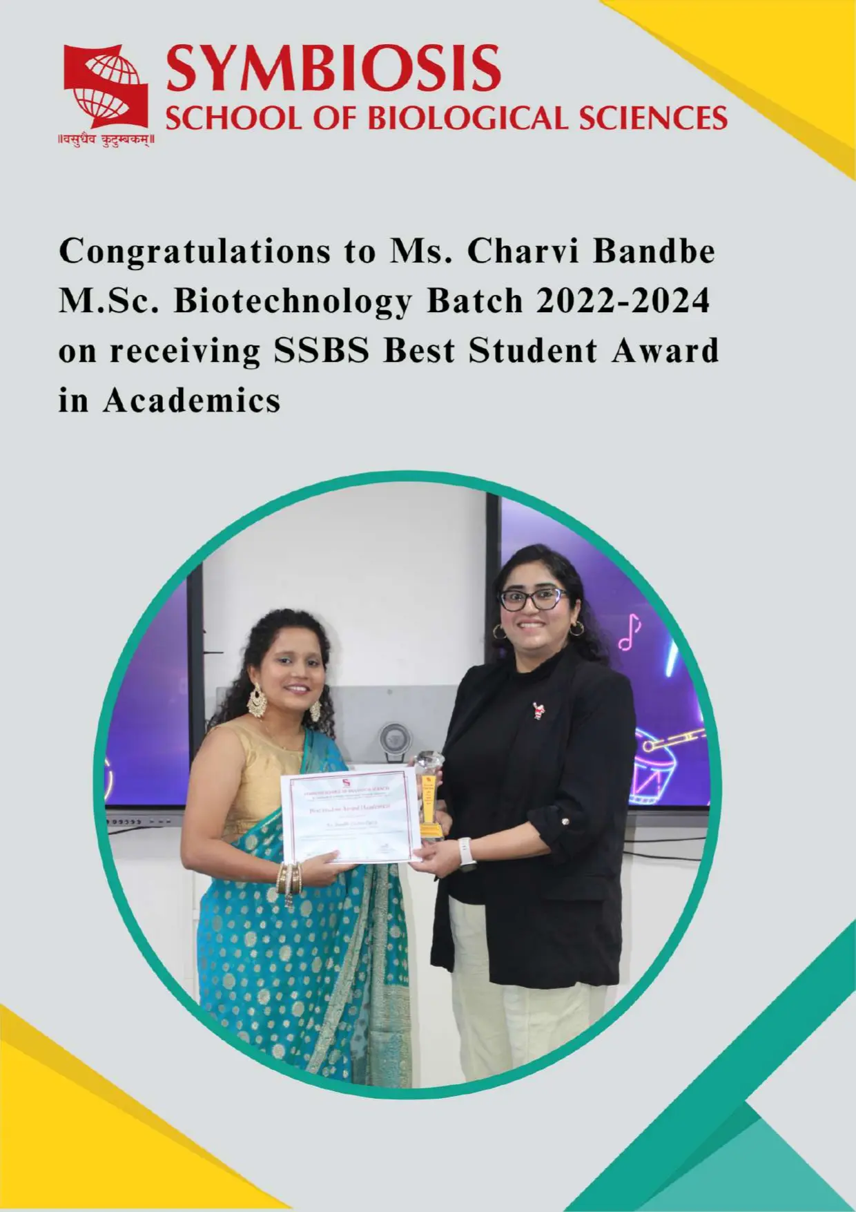 Congratulations, Ms. Charvi Bandbe, M.Sc. Biotechnology, Batch 2022-2024 for placed Symbiosis School of Biological Sciences (SSBS), Pune for the position of Junior Research Fellow.