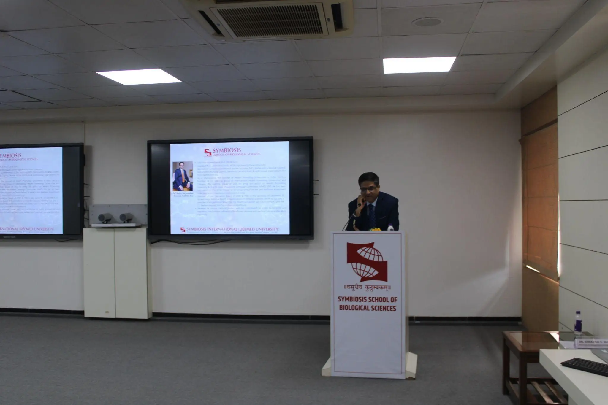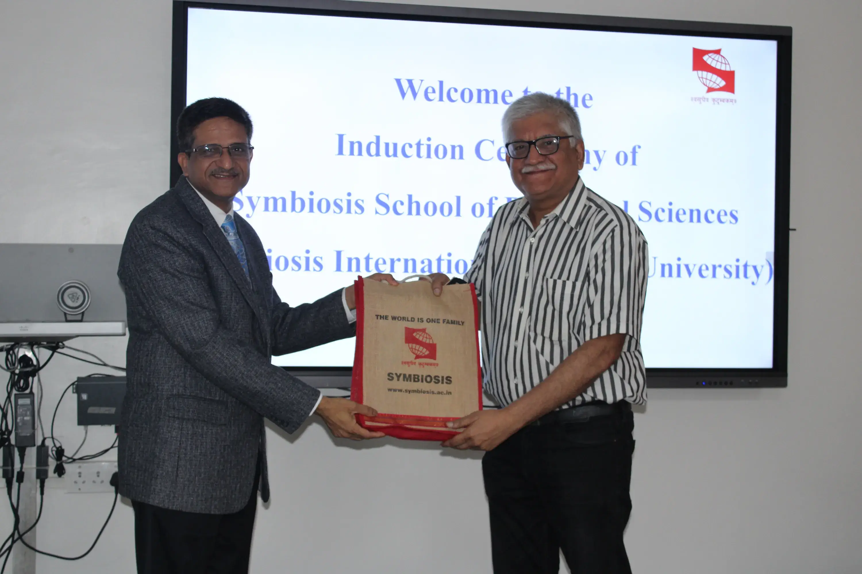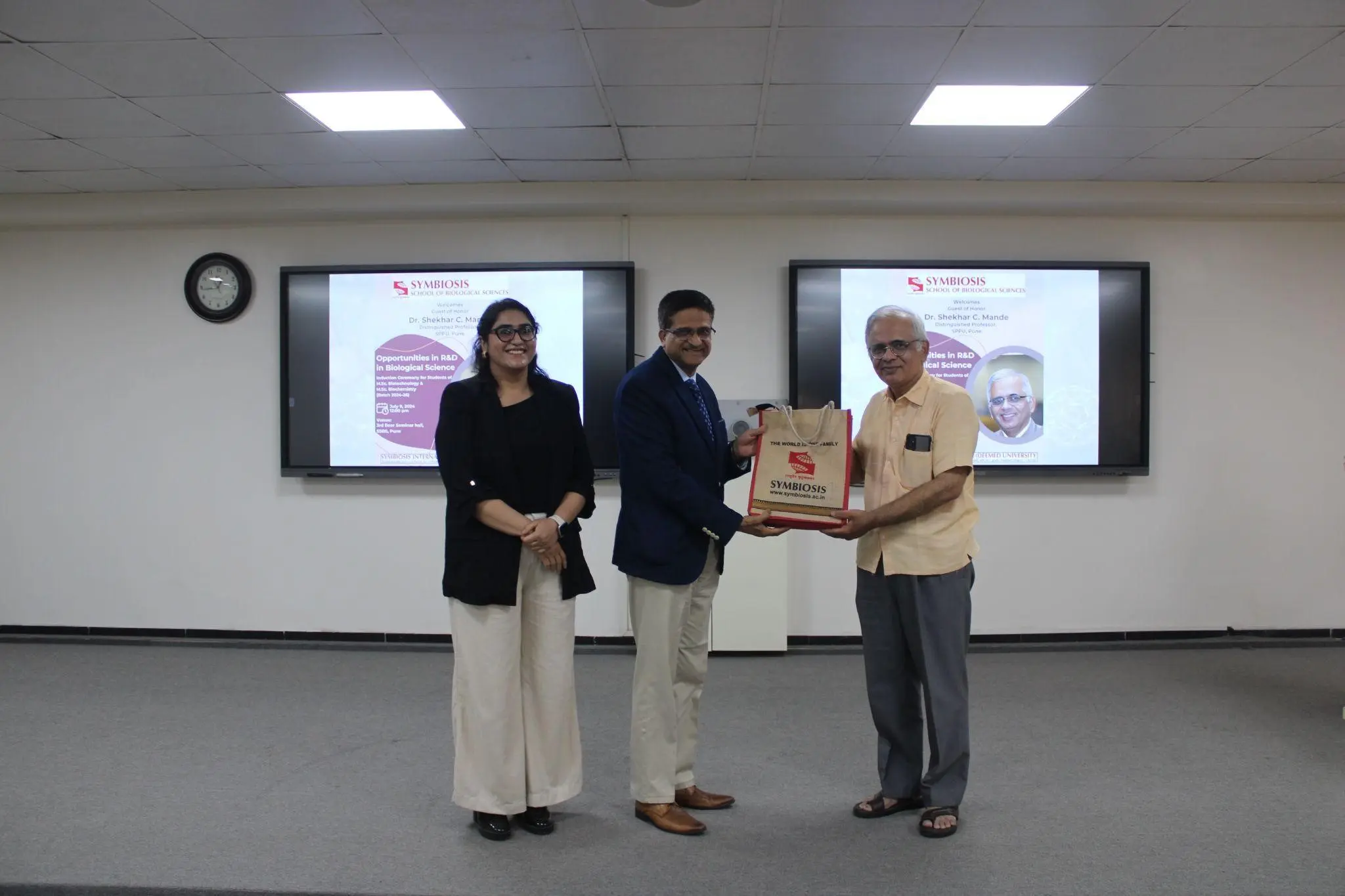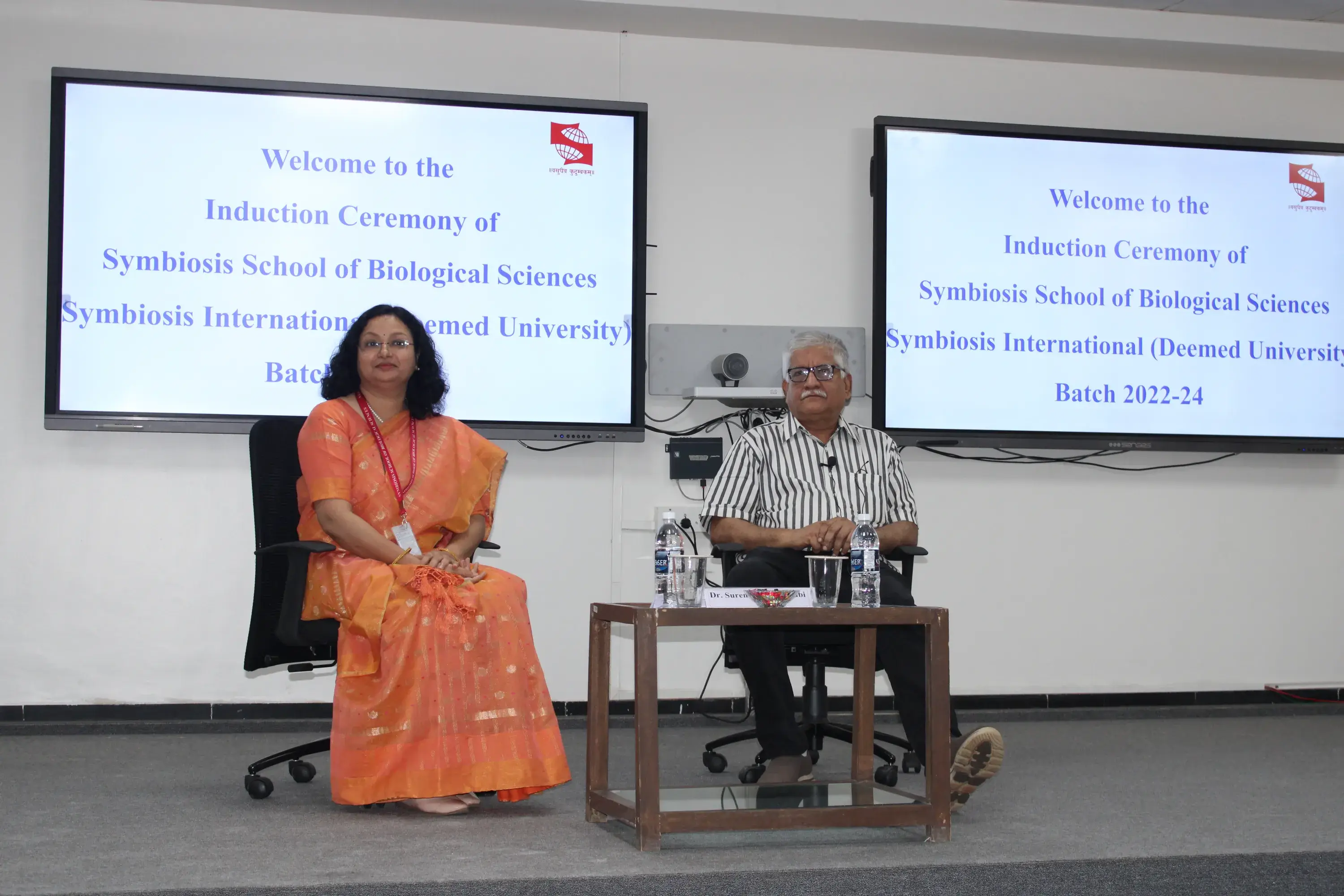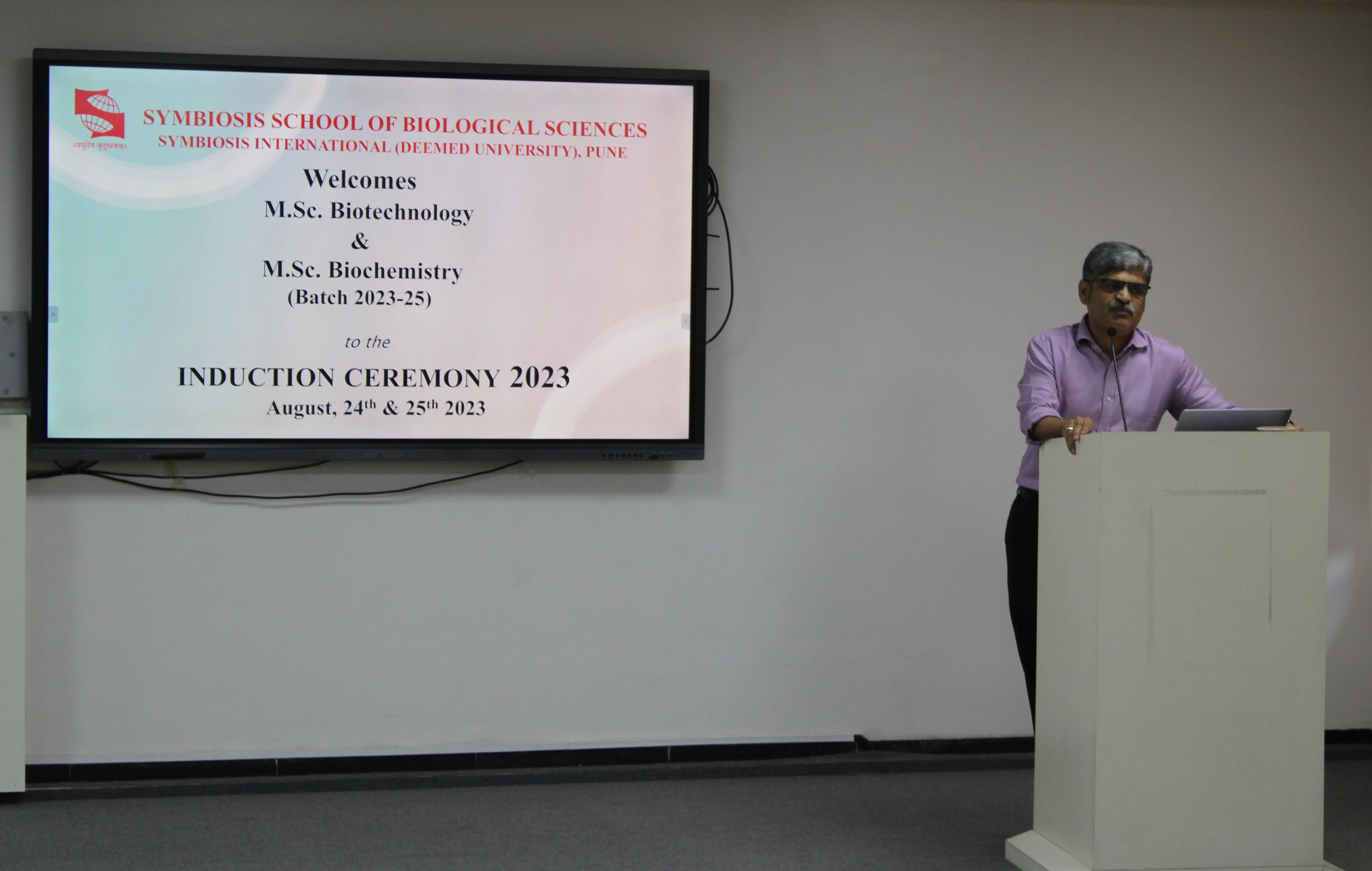 The induction ceremony of Deeksharambh-2024 was graced by the Guest of honour Dr. Shekhar C. Mande, Distinguished Professor, Savitribai Phule Pune University, Pune and Dr. Rajiv Yeravdekar, Provost, Faculty of Medical and Health Sciences, Symbiosis International (Deemed University), Pune. The induction ceremony was attended by the senior batches of M.Sc. Biotechnology and M.Sc. Biochemistry students (2023-25 batch), SSBS Ph.D. scholars, SSBS faculty members and staff.